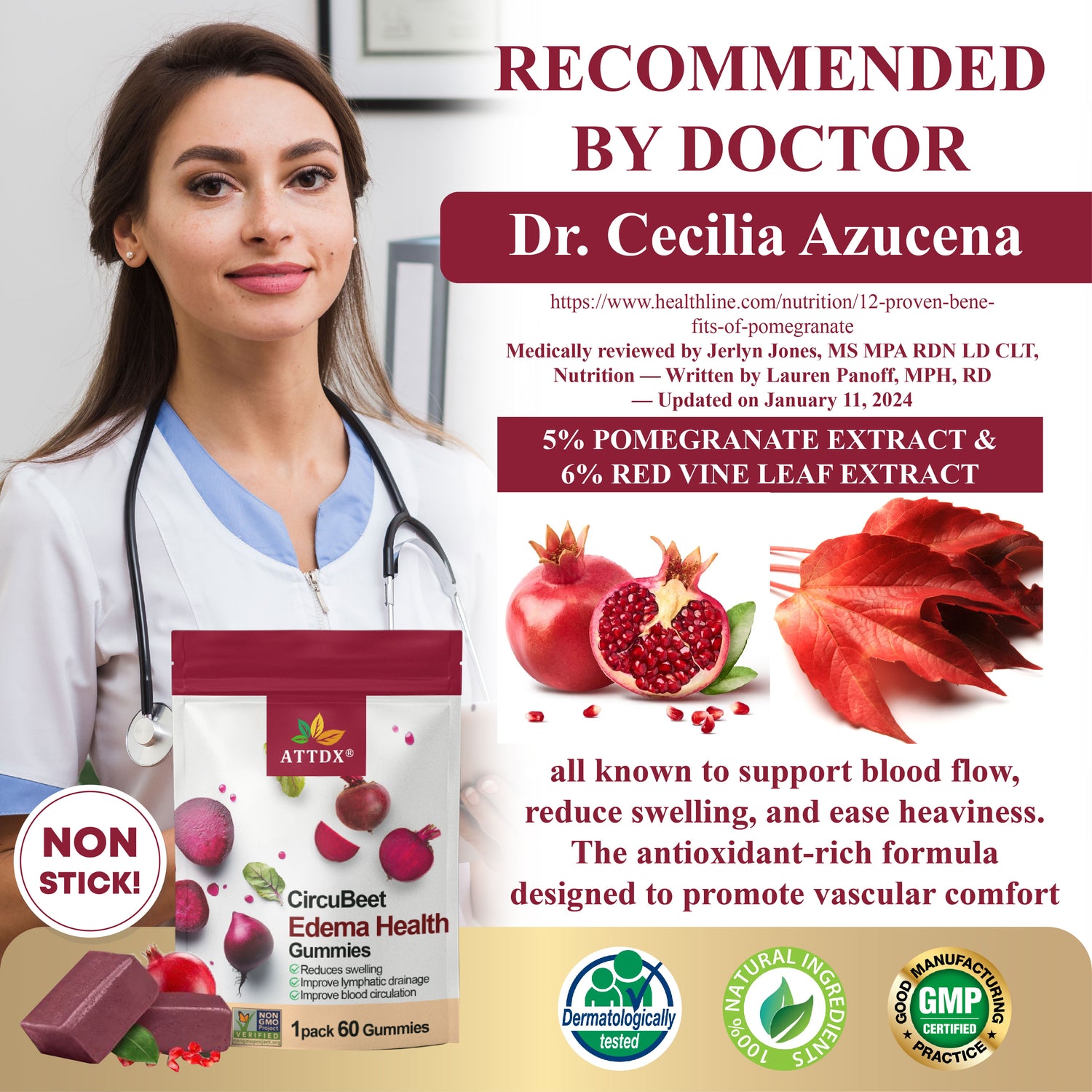 “As a physician specializing in circulatory and lymphatic wellness, I’ve reviewed the formulation of ATTDX® CircuBeet Edema Health Gummies with interest. It contains a balanced blend of 8% Beetroot Extract, 5% Pomegranate Extract, and 6% Red Vine Leaf Extract—all known to support blood flow, reduce swelling, and ease heaviness. The antioxidant-rich formula is thoughtfully designed to promote vascular comfort and overall body lightness. Based on my assessment, I consider this formulation effective and well-aligned with current evidence-based practices.” – Dr. Cecilia Azucena, M.D.