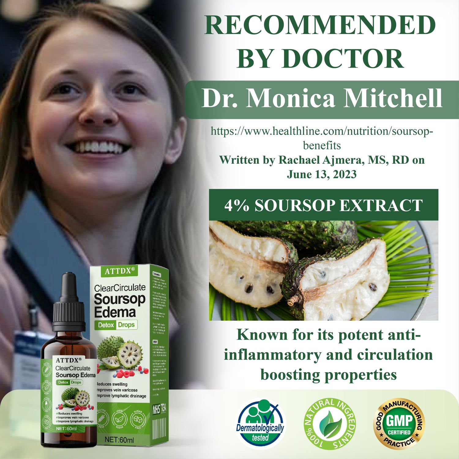 Examined and reviewed by Dr. Monica Mitchell(Click to learn more), ATTDX® ClearCirculate Soursop Edema Detox Drops containing 4% Soursop extract, the formulation utilizes the plant’s natural diuretic and anti-inflammatory properties to reduce fluid retention and alleviate swelling associated with poor circulation or localized inflammation. Clinical observations noted improved capillary integrity and a reduction in interstitial fluid buildup with consistent use. The drops present a promising adjunctive option for managing mild to moderate edema in non-emergent cases.