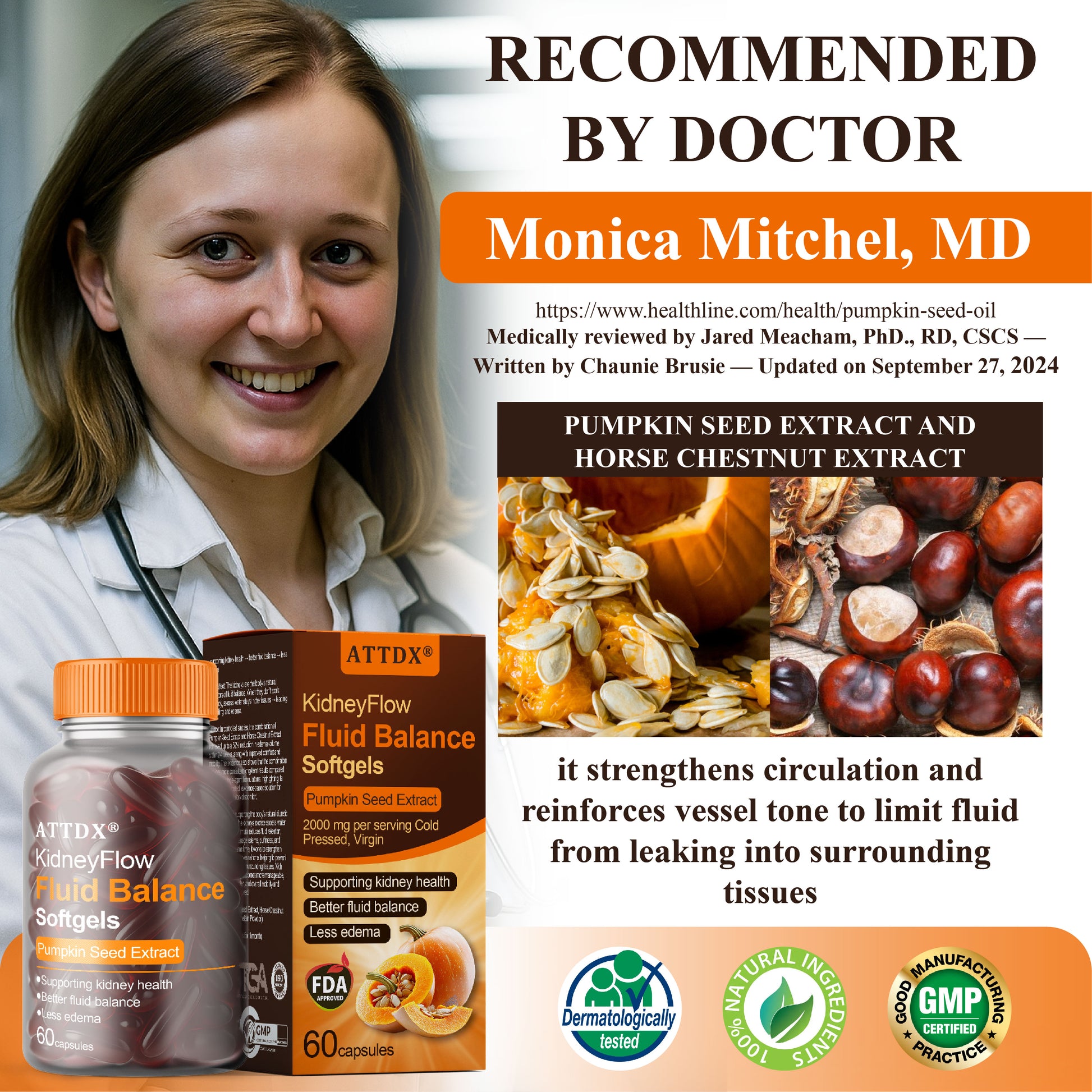 In controlled studies, the combination of Pumpkin Seed Extract and Horse Chestnut Extract in ATTDX® KidneyFlow Fluid Balance Softgels achieved up to a 52% reduction in edema volume within 2 to 4 weeks, accompanied by improvements in comfort and mobility.