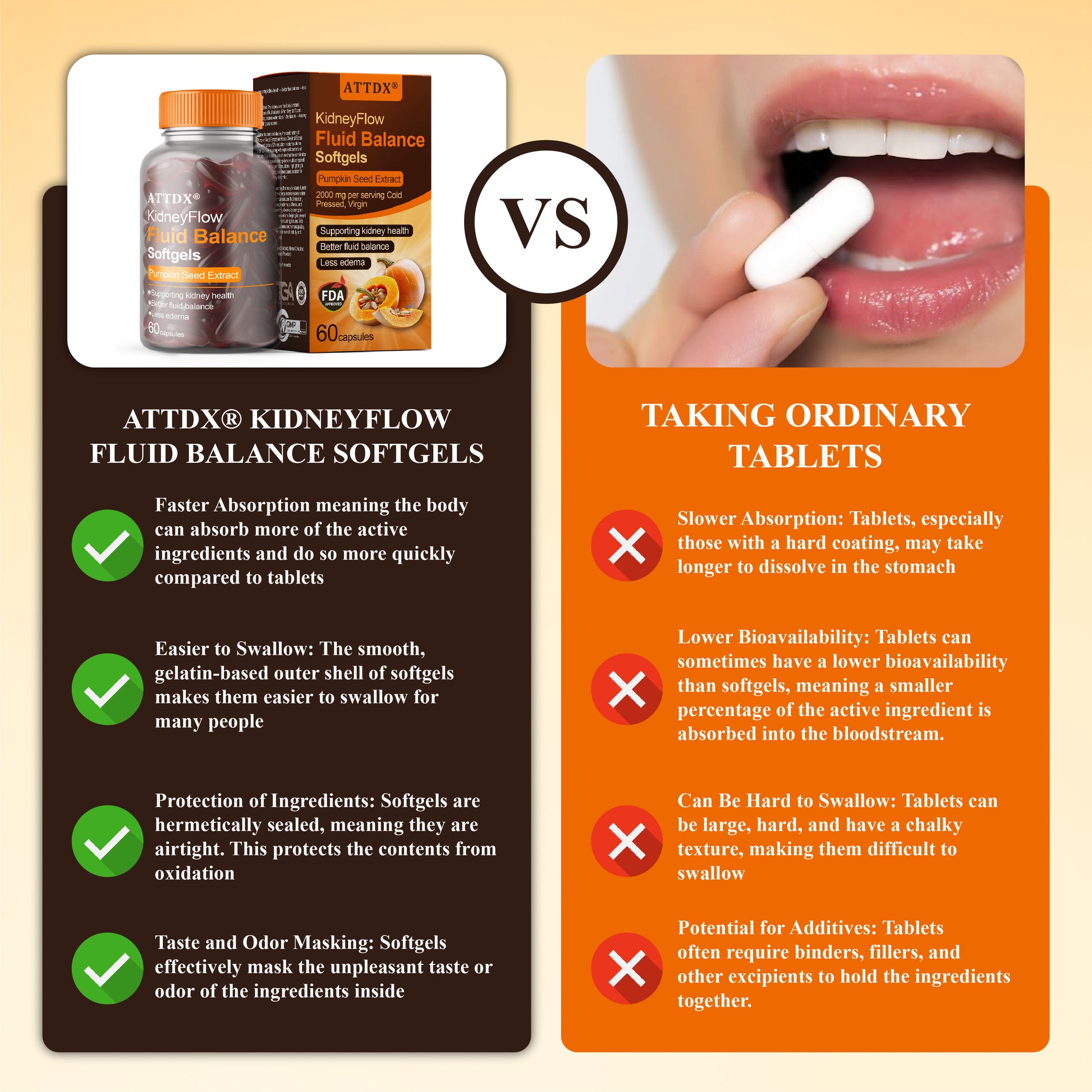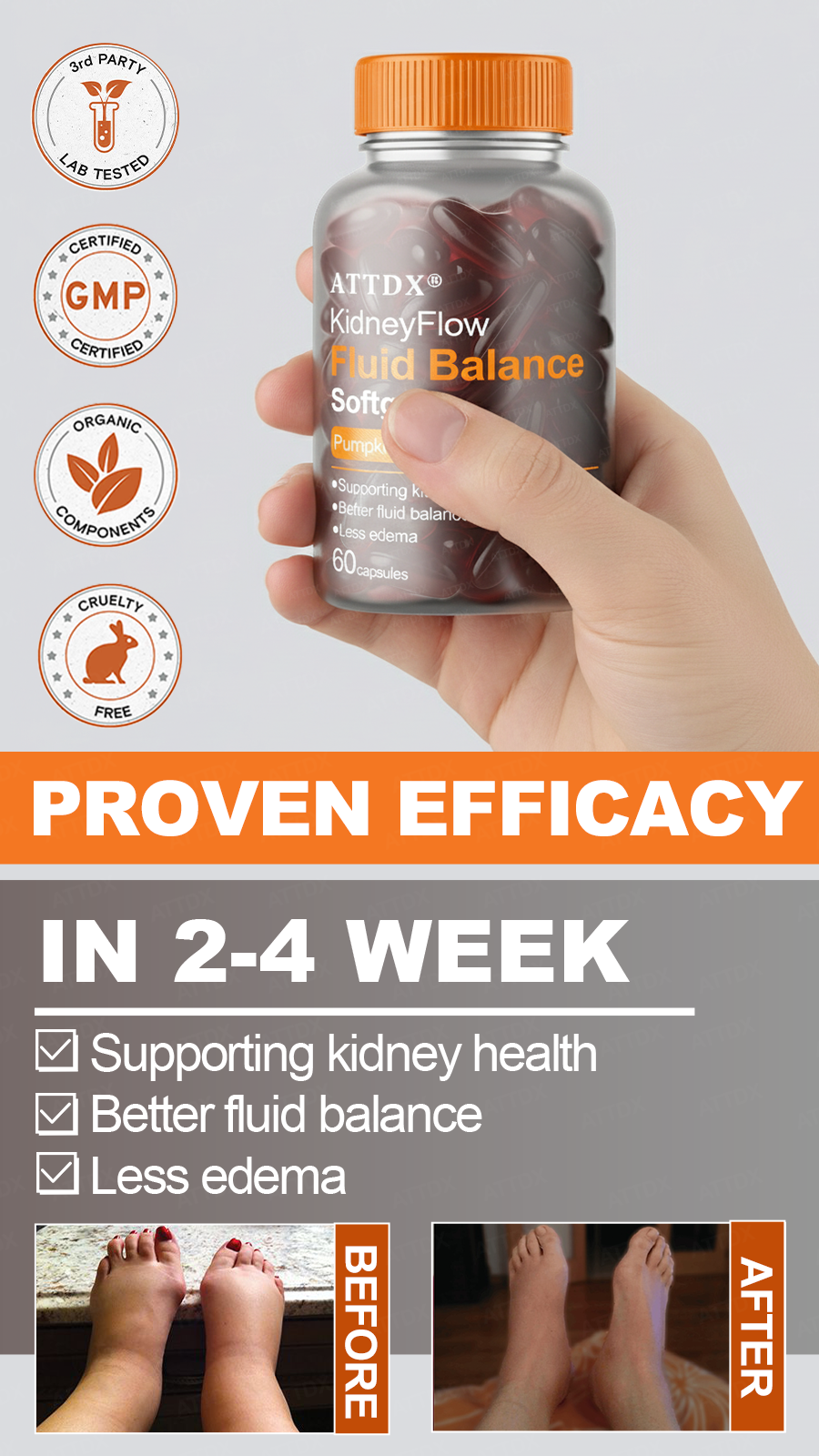 Choose ATTDX® KidneyFlow Fluid Balance Softgels to address swelling that often stems from the kidneys not releasing excess water efficiently. The formula supports fluid balance and circulation, helping reduce puffiness and heaviness. With regular use, it restores comfort and makes daily movement feel easier.