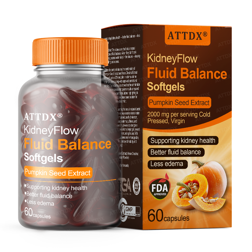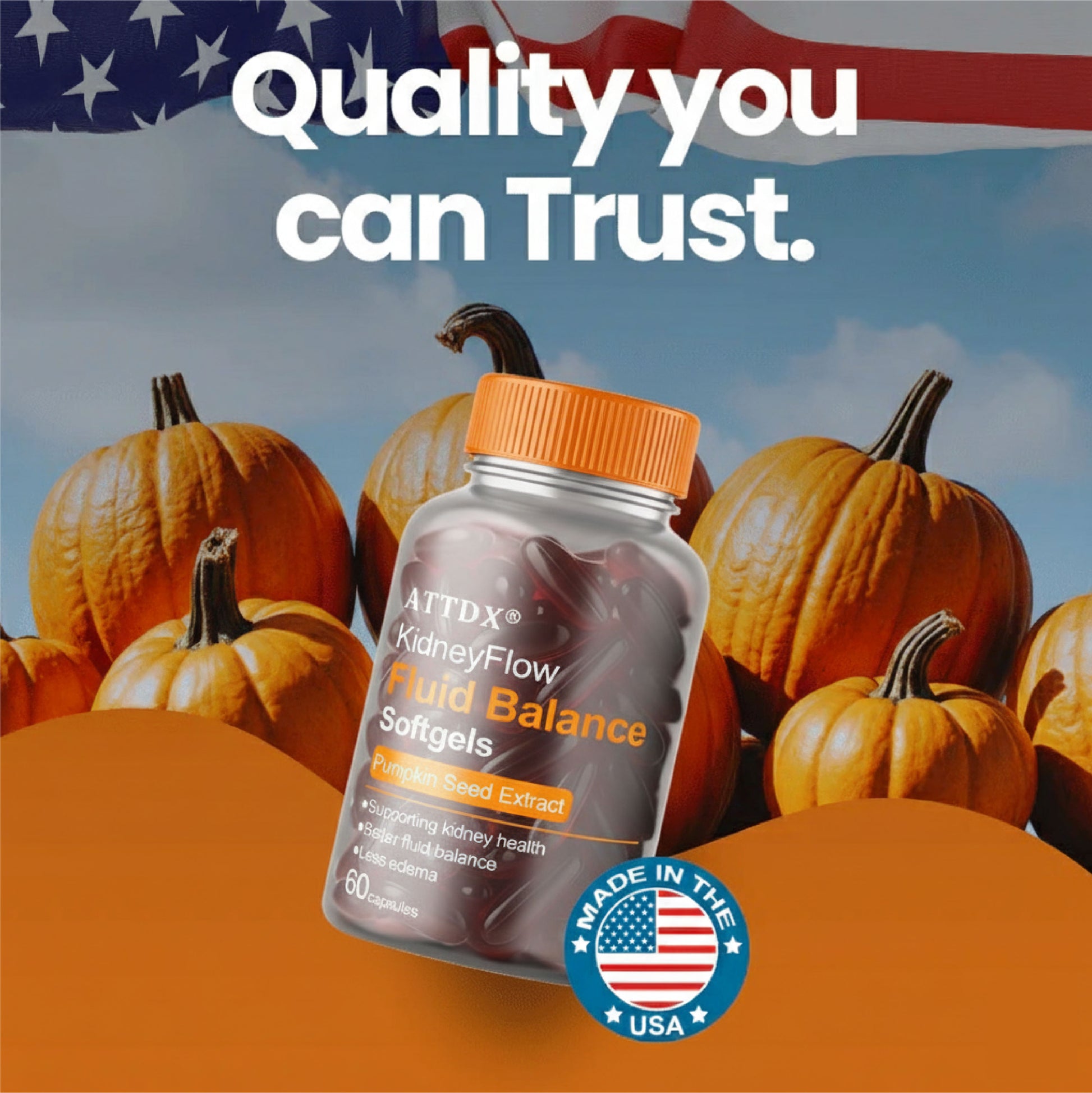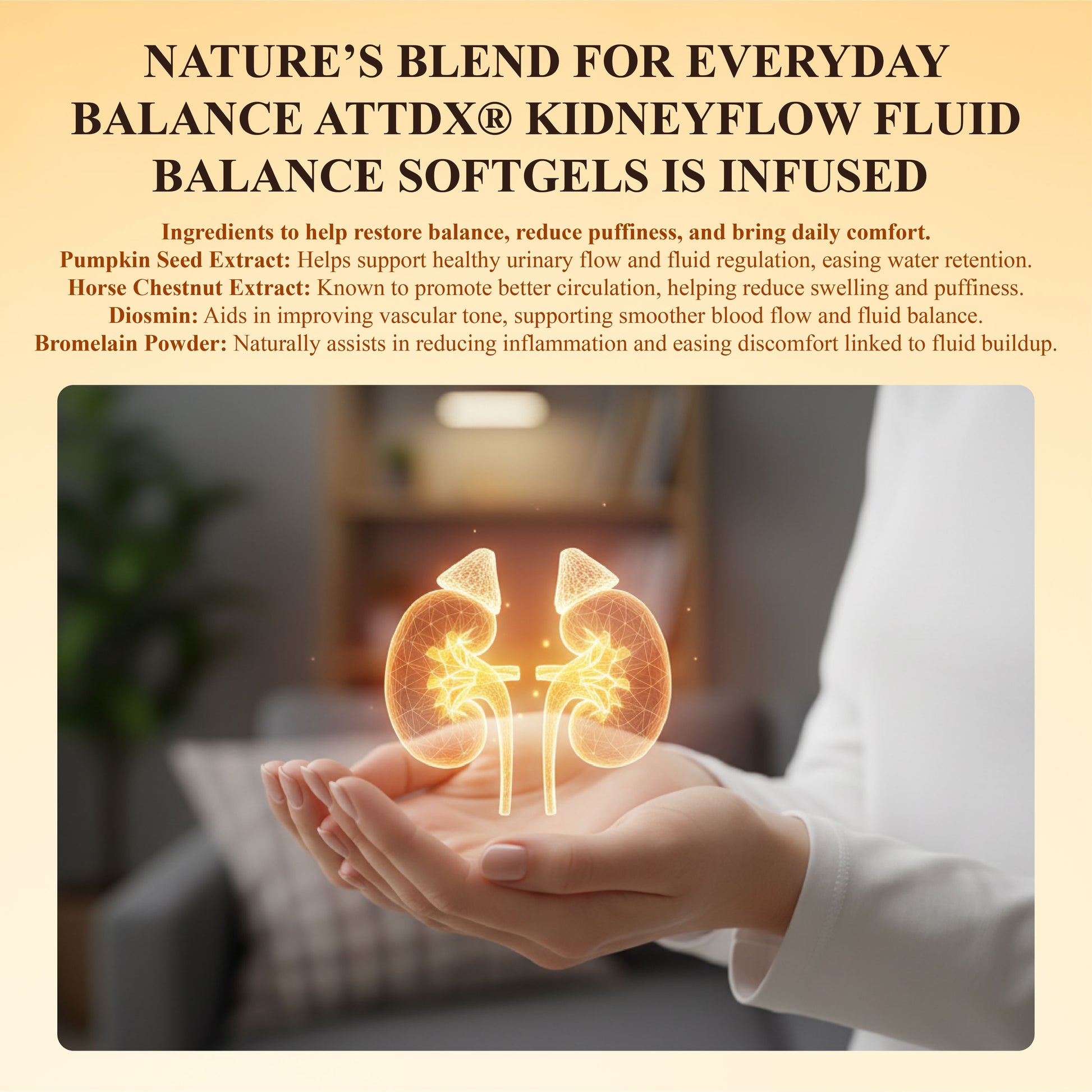 Stay light with ATTDX® KidneyFlow Fluid Balance Softgels, powered by Pumpkin Seed and Horse Chestnut Extracts. This smart blend helps ease puffiness and keep you feeling comfortably balanced every day.