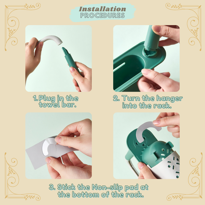 This MIGHTY RACK has some FUNCTIONAL DETAILS such as VENTILATED HOLES that KEEPS the STORAGE so with the SOAPS, SPONGES, BRUSHES DRY ALL THE TIME as it EVENLY DISTRIBUTES the WATER for SAFE EXIT and PREVENTS the GROWTH of BACTERIA. The TOWEL BAR makes the CLOTH HANGING amazingly EASY and WITHIN REACH and to KEEP those damp cloth DRY, VENTILATED, CLEAN, and HYGIENIC.